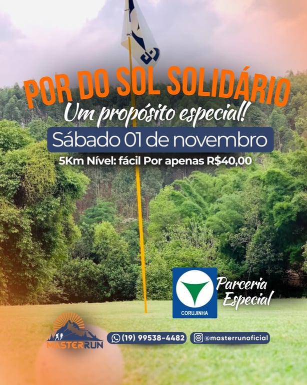 No dia 01/11, às 15h, vamos caminhar juntos em uma trilha de 5 km, nível fácil, em meio às belezas naturais da fazenda que abriga os campos de golfe do Projeto Corujinha, em Louveira. O valor será integralmente destinado às ações beneficentes do Projeto Corujinha, que utiliza o golfe como ferramenta de inspiração, disciplina e transformação na vida de crianças em situação de vulnerabilidade social.