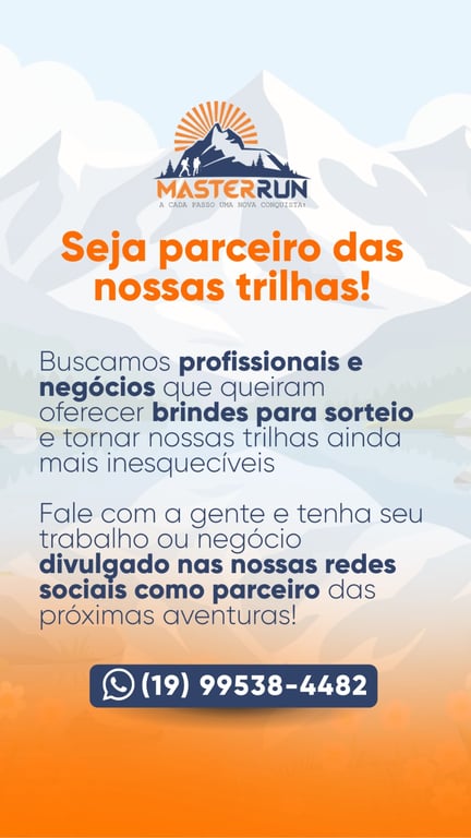 "Queremos unir forças com profissionais e negócios que acreditam em experiências únicas. Seus brindes serão sorteados durante nossas trilhas, e você ainda terá sua marca divulgada nas nossas redes sociais para milhares de seguidores."