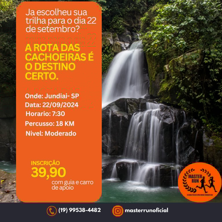 Você já trilhou pela Rota das Cachoeiras em Jundiaí? Venha viver essa experiência conosco, em um lugar repleto de aventuras e paisagens magníficas! São 18 km em estrada de terra, totalmente arborizada que promete surpreender e encantar os amantes da natureza. Nessa jornada, você será guiado por um especialista conhecedor de toda região, você será levado a descobrir a beleza natural da região, passando por lugares imperdíveis! Passaremos em um lago, pela cachoeira da curva, cachoeira da Macumba e a cachoeira do Guard Rail.
