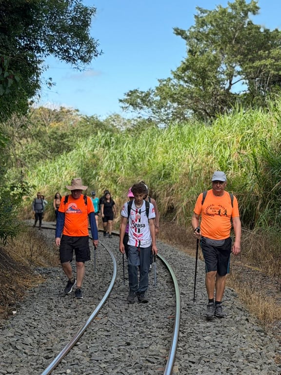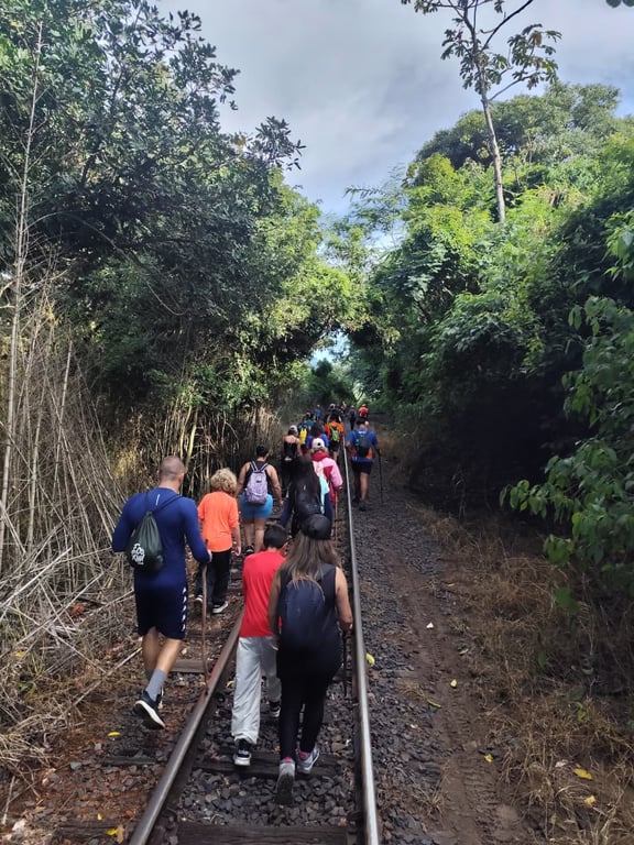 O percurso é variado e desafiador, passando por trechos de linha de trem, trilhas em meio à mata e estradão, tornando a caminhada dinâmica e envolvente. Ao longo do trajeto, o grupo passará por sete cachoeiras, sendo duas delas com poços excelentes para banho, perfeitas para relaxar e recarregar as energias.